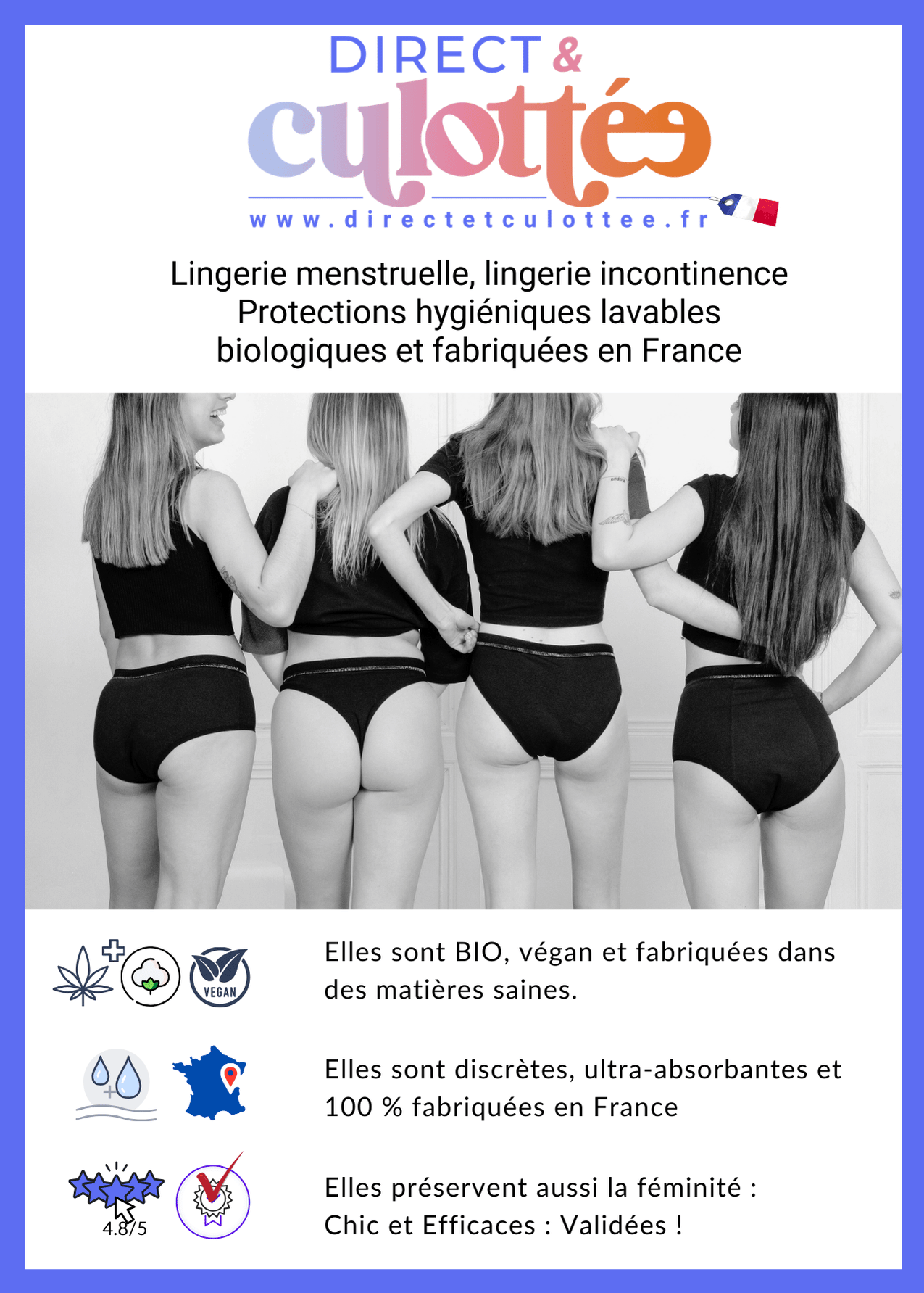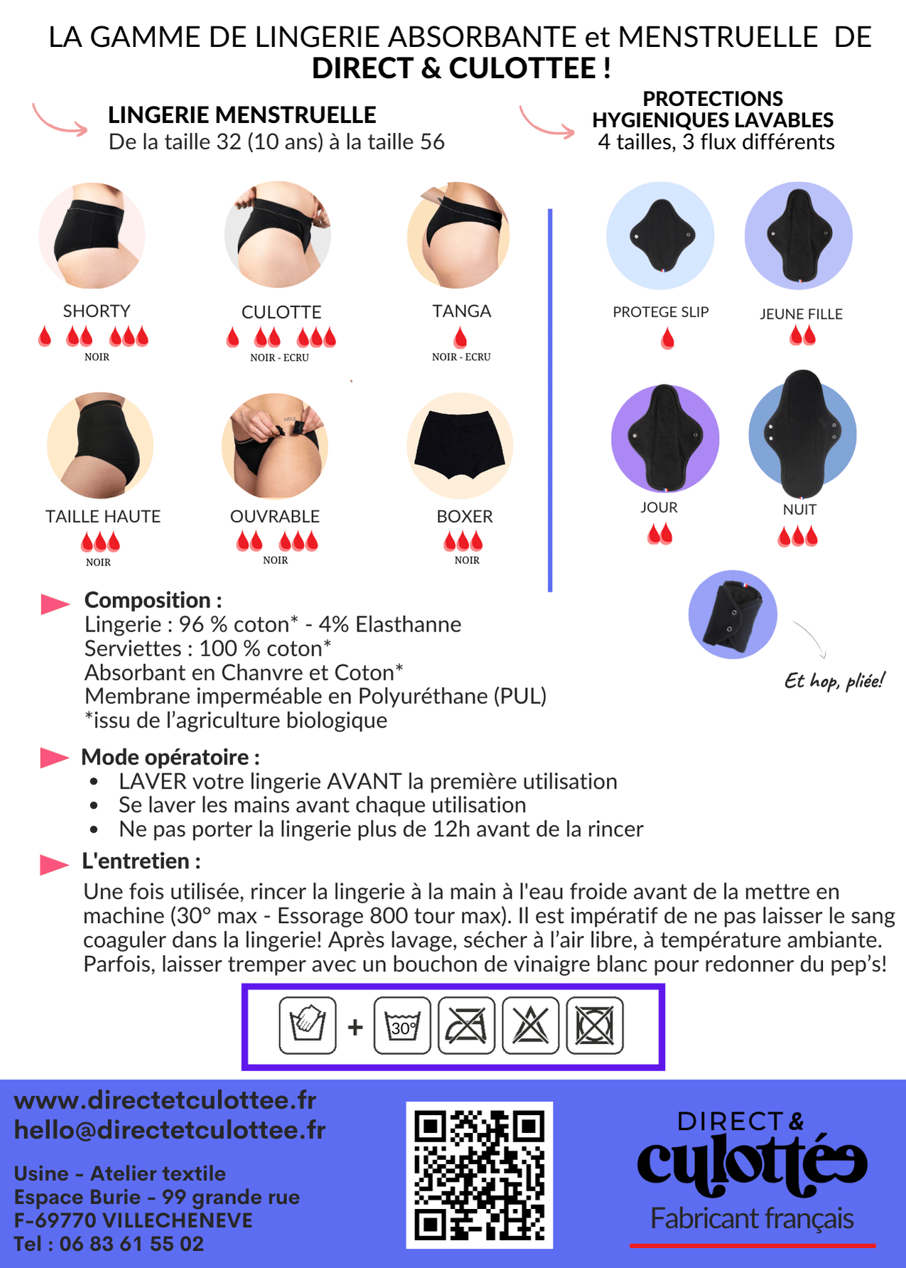 Chez DIRECT & CULOTTEE, la transparence est une priorité. À la suite d’un contrôle de la DGCCRF (Direction Générale de la Concurrence, de la Consommation et de la Répression des Fraudes), nous avons renforcé et complété les informations obligatoires relatives à la composition et aux conditions d’utilisation de nos culottes menstruelles, afin de garantir une information claire, loyale et conforme à la réglementation française.